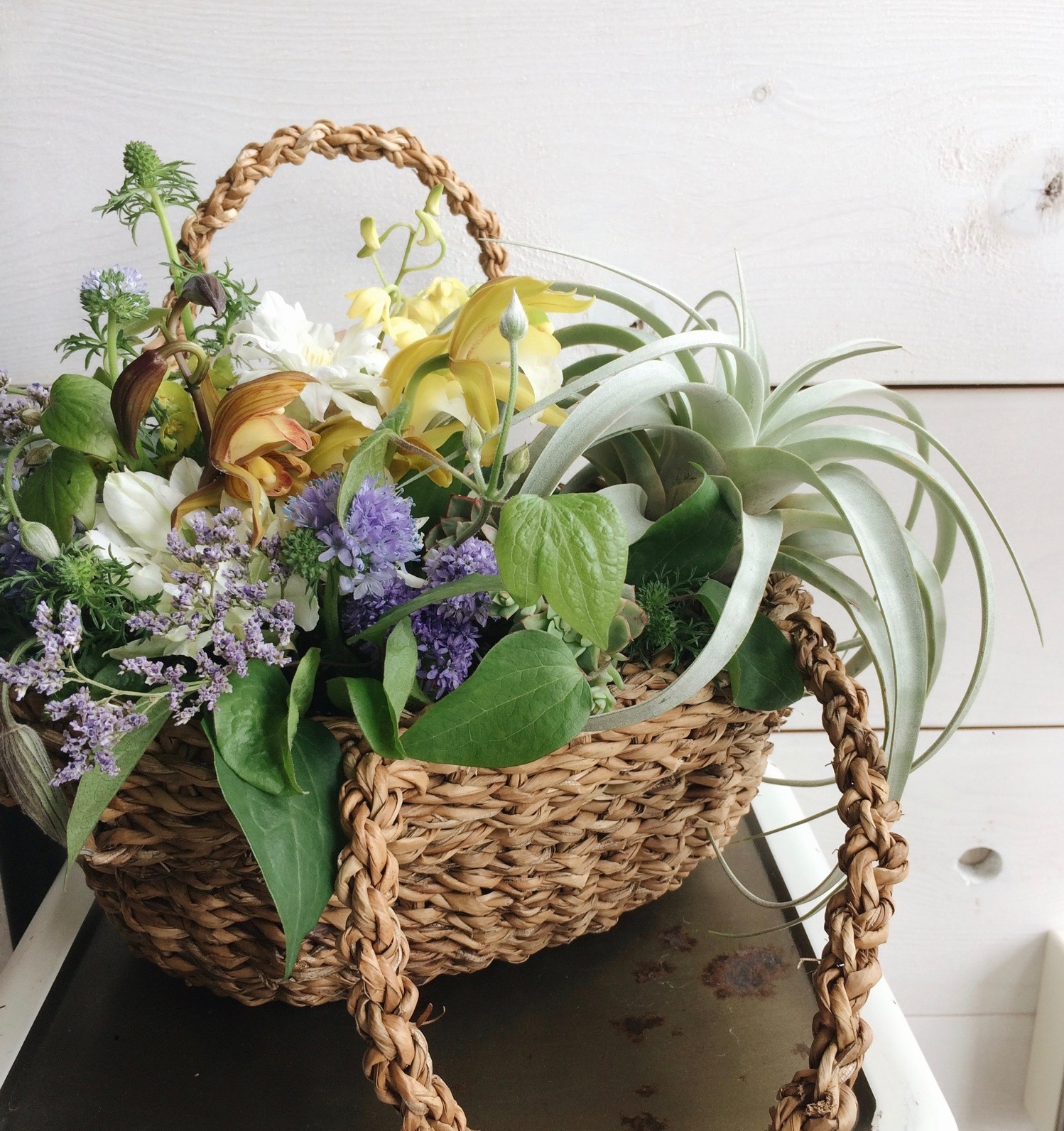 こちらでセレクトしたチランジアを季節の花のアレンジメントとともにカゴにおいれします。