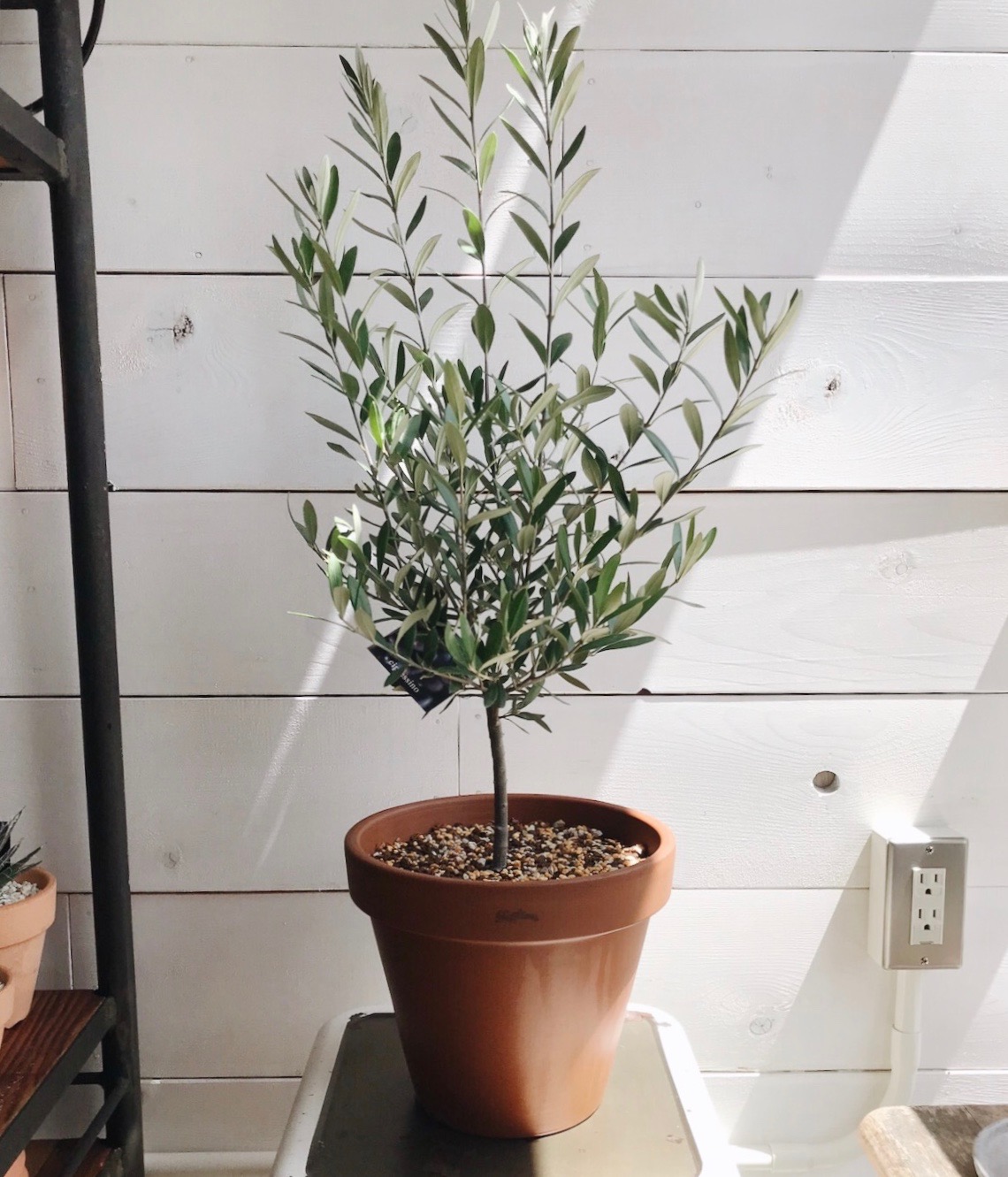 樹形も可愛い人気のオリーブを素焼きポットに植えました。
